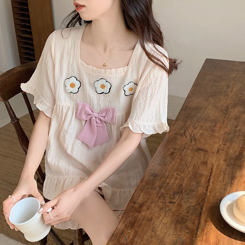 Chất liệu chính: Bông Thành phần nội dung: 100% Độ dày: Bình thường Phù hợp cho: Nữ Phong cách mặc nhà: ngọt ngào Chiều dài tay áo: ngắn tay Chi tiết phong cách quần áo: thêu Loại cổ áo: Cổ tròn Chiều dài quần: quần ngắn