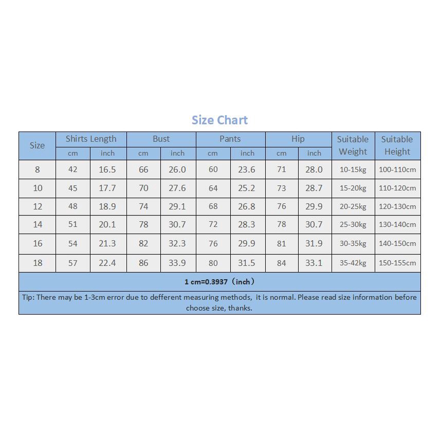 Lưu ý: Size đồ ngủ trẻ em chọn tùy thuộc vào chiều cao và cân nặng! Không phải dựa vào độ tuổi! Xin vui lòng tham khảo Bảng size trước khi mua sắm, cảm ơn. --------------------------------------- Size 8 Chiều cao khuyến nghị: 100-110cm; Size 10 Chiều cao khuyến nghị: 110-120cm; Size 12 Chiều cao khuyến nghị: 120-130cm; Size 14 Chiều cao khuyến nghị: 130-140cm; Size 16 Chiều cao khuyến nghị: 140-150cm; Size 18 Chiều cao khuyến nghị: 150-155cm; --------------------------------------- Vui lòng tham khảo biểu đồ kích thước trong hình thứ hai để biết thêm chi tiết kích thước.