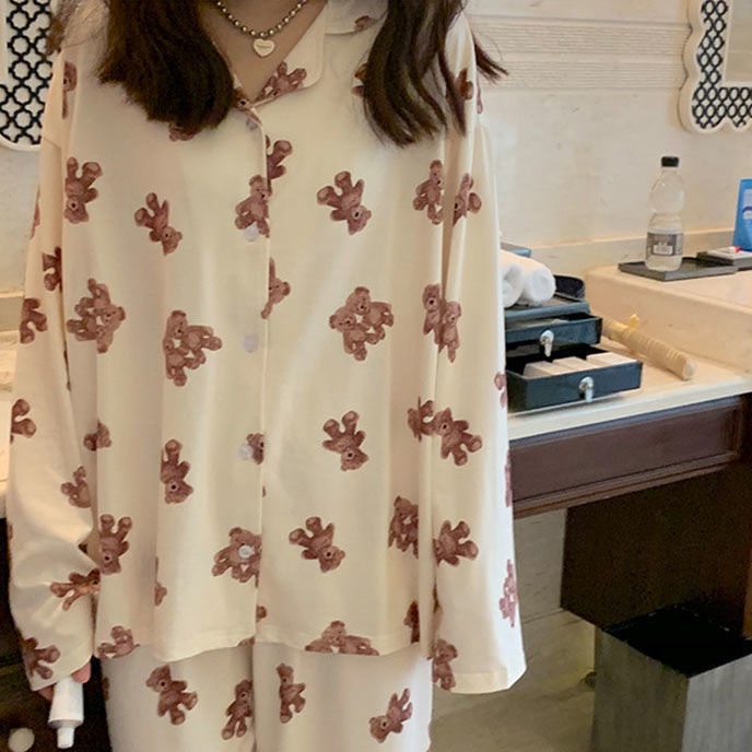 Giới thiệu Bộ đồ ngủ tay dài in hình gấu dễ thương phong cách Hàn Quốc cho nữ