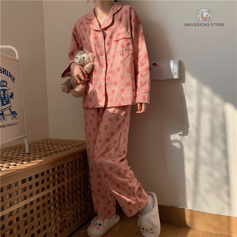 Giới thiệu Bộ đồ ngủ tay dài in hình quả dâu dễ thương phong cách Nhật Bản