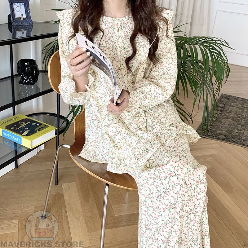 Giới thiệu Bộ Đồ Ngủ Tay Dài Phối Bèo In Hoa Phong Cách Hàn Quốc Xinh Xắn Cho Nữ