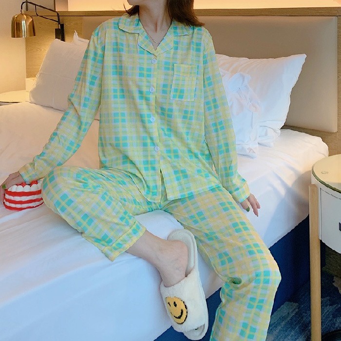 Giới thiệu Bộ Đồ Ngủ Tay Dài Vải Cotton In Họa Tiết Caro Xinh Xắn Cho Nữ