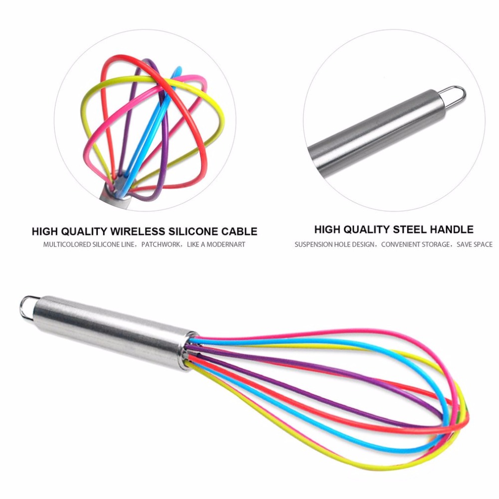 Tên sản phẩm: Cây đánh trứng Chất liệu: Silicon cấp thực phẩm Chất liệu tay cầm: Thép không gỉ Đặc trưng: Hướng dẫn sử dụng, dụng cụ nhà bếp, dễ sử dụng, nhiều màu Kích thước (gần đúng) 12 inch: 30X7cm 10 inch: 26X6cm 8 inch: 21X4,2cm Đường kính dây: 2mm 5 sợi