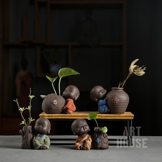 Tượng Chú Tiểu Và Chậu Gốm Cấm Hoa Tửu Cát Phong