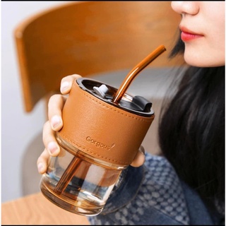 Cốc thủy tinh Gorgous vỏ da có nắp, ống hút đi kèm ( màu ngẫu nhiên )