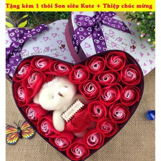 Quà tặng bạn gái 8/3 - Hộp Hoa Hồng Sáp Thơm Trái Tim 20 Bông + gấu bông + tặng kèm 1 thỏi Son và Thiệp
