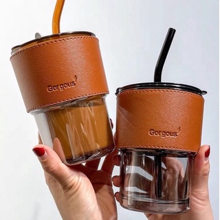 Ly, cốc thủy tinh đựng nước có ống hút và bao da chịu nhiệt 450ml xinh xắn