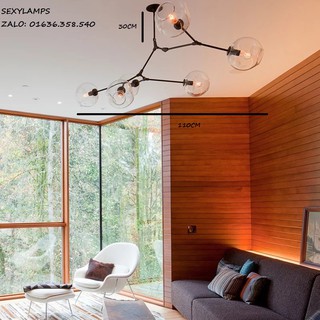 ĐÈN THẢ BÀN ĂN- ĐÈN THẢ PHÒNG KHÁCH LINDSEY THẢ NGANG_CÀNH ĐEN_6 CHAO THỦY TINH TRẮNG