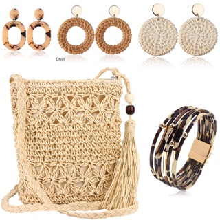Bộ 5 Bông Tai / Vòng Tay / Dây Đeo Chéo / Túi Xách Đan Mây Handmade Phong Cách Boho Thời Trang Mùa Hè Cho Nữ
