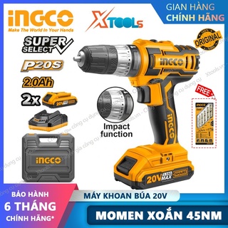 Bộ máy máy khoan pin 3 chức năng INGCO CIDLI200215, máy khona búa pin 20V kèm theo 2 pin, 1 củ sạc 2h, vali đựng đẹp