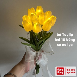Hoa Tuylip có đèn led phát sáng bó 10 bông hoa lụa giả kèm nơ xinh decor trang trí nhà cửa quà tặng