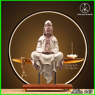Thác khói trầm hương đèn led Tân Nguyên, tượng Phật Bà Quan Âm, đèn hào quang Phật, kèm hoa sen, chuỗi hạt TK145