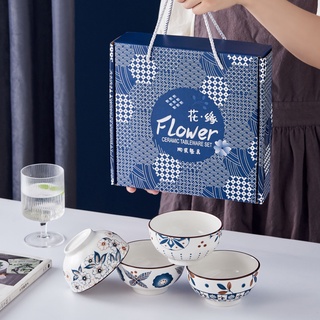 Set chén bát chén sứ phong cách Nhật Bản hoa xanh kèm hộp giấy sang trọng dùng hàng ngày, làm quà tặng-Ráp