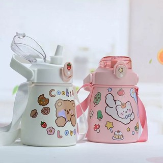 Bình nước giữ nhiệt 1100ml kèm ống hút, dây và miếng dán stiker đáng yêu _ supersale365