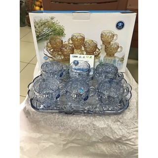 bộ 6 ly cốc soga thủy tinh kèm khay thủy tinh xanh