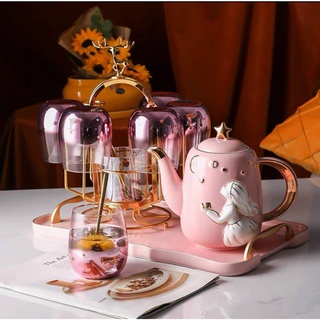 Bộ ấm chén kèm khay sứ pha trà họa tiết hoa nắp thỏ