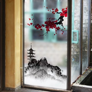 Decal trang trí kính cao cấp phong cảnh Tháp Núi cùng hoa Đào đỏ ( 60cm x 116cm)