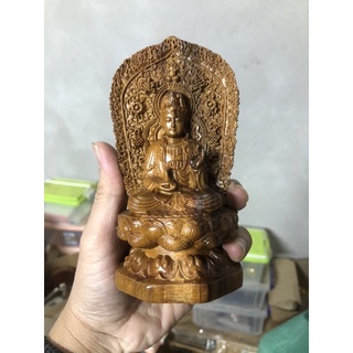 Tượng phật bà quan âm đục 2 mặt - đặt tablo ô tô 12x6 cm gỗ bách xanh