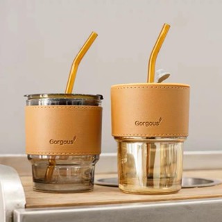 Cốc Thủy Tinh 450ML Bọc Da Cao Cấp Tặng Kèm Nắp Đậy Và Ống Hút