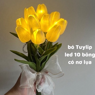 Bó 10 bông hoa tuylip đèn led phát sáng Hoa lụa giả kèm nơ xinh Decor trang trí nhà cửa, phụ kiện chụp studio