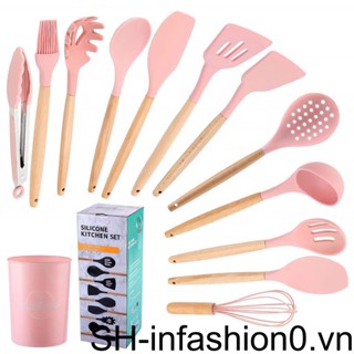 Bộ 13 Dụng Cụ Nấu Ăn Bằng Silicone Cán Gỗ Màu Hồng
