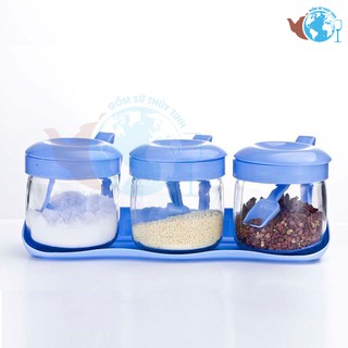 Combo 3 lọ đựng gia vị bằng thủy tinh 300ml có nắp đậy và kèm muỗng và khay nhựa CHZ3403 màu ngẫu nhiên