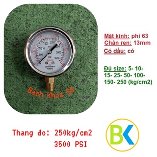 Đồng hồ áp suất Badotherm, có dầu, phi 63, chân ren 13mm, đủ size từ 5kg- 250kg/cm2