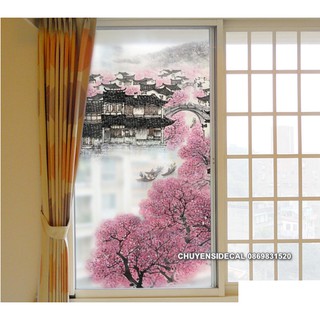 Decal Dán Kính Cao Cấp - Phong Cảnh Hữu Tình Hoa Đào Hồng ( 60x116cm )