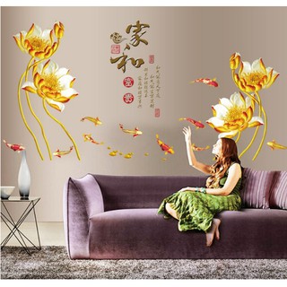 Decal trang trí tường Hoa Sen nhánh dà và đàn cá KOI bơi quanh hồ