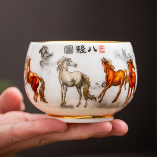 Chén Chủ Nhân Sứ Cảnh Đức Vẽ Tay Thủ Công Họa Tiết Bát Tuấn Đồ 200 ml, Lòng Chén Dát Vàng 24K Độc Đáo
