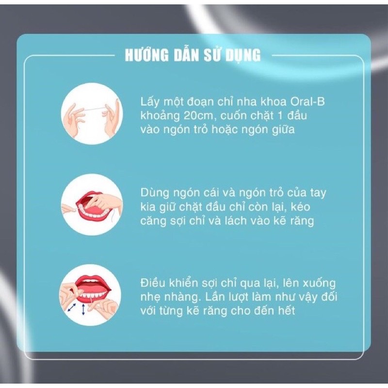 Chú ý: Sợi chỉ phải ôm sát bề mặt răng, kéo nhẹ theo chiều trước sau, và kéo về phía mặt nhai, không sử dụng động tác kéo chỉ theo chiều ngoài trong với biên độ lớn Bảo quản nơi khô ráo, thoáng mát, tránh ánh nắng trực tiếp và nhiệt độ cao Để xa tầm tay trẻ em