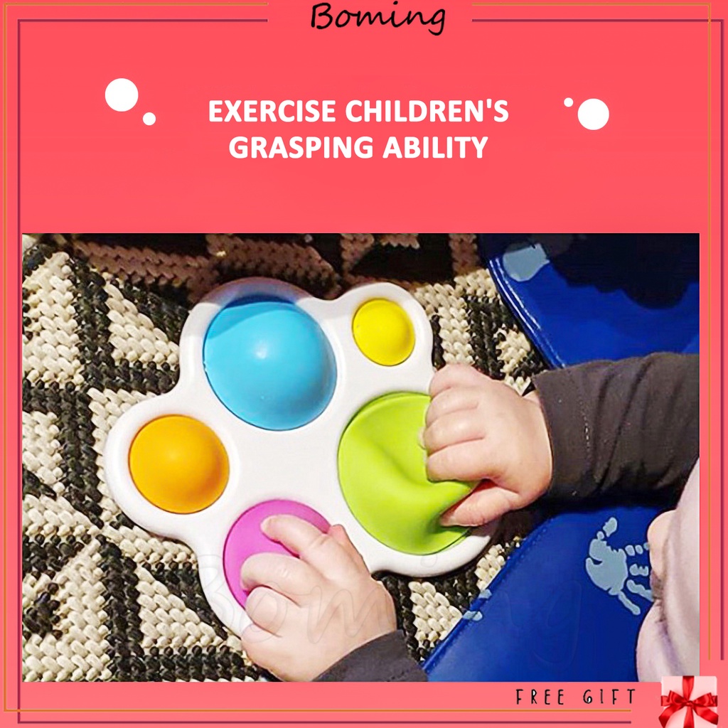 Thông tin sản phẩm Thiết kế an toàn trong khung nhựa ABS chắc chắn là năm bong bóng silicon sống động, không độc hại và không gây hại, đồng thời bong bóng có kích thước và màu sắc khác nhau. Dành cho trẻ sơ sinh, đồ chơi giác quan tuyệt vời, có thể nhấn xuống bên dưới và lật lại, mang lại niềm vui đơn giản cho bé. Khuyến khích các kỹ năng vận động xuất sắc, khám phá giác quan, học hỏi, kỹ năng vận động tốt, thiết kế màu kẹo thu hút sự chú ý của trẻ. Thích hợp cho bé cầm nắm, chơi đùa, mang lại cảm giác vui vẻ cho bé mà còn rèn luyện khả năng tập trung.
