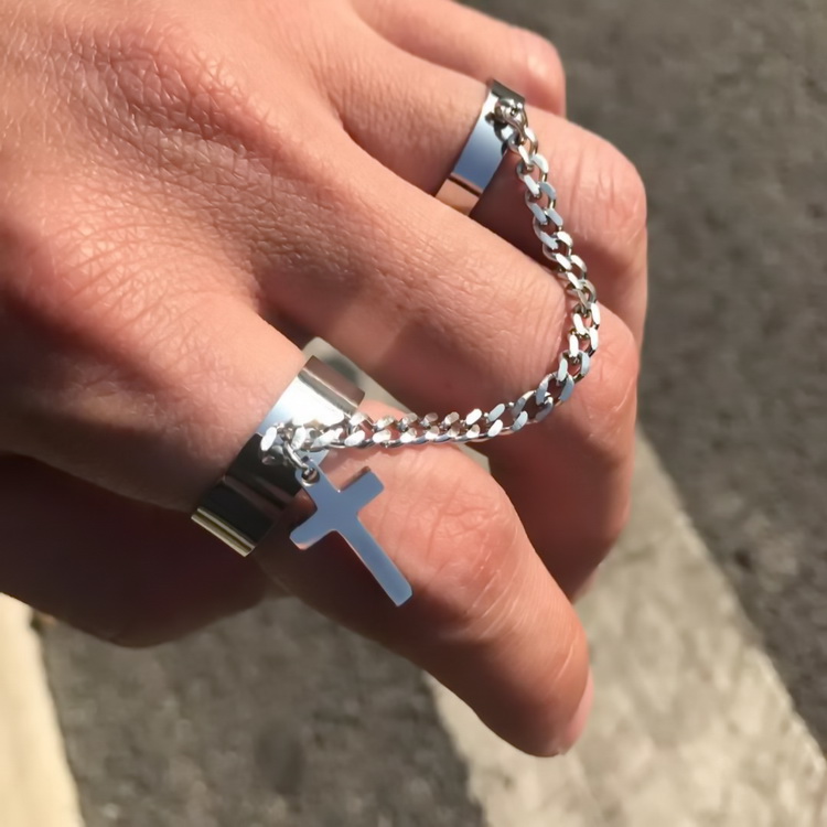 Chain cross ring punk hip hop integrated ring men and women trendy Product name: chain cross combination ring Style: fashion trend, punk hip-hop style Color: silver Applicable scenarios: gifts, appointments, banquets, fashion collocation, daily life, etc. Material: Alloy Size: chain length is about 10cm, diameter is about 1.7cm quantity: 1