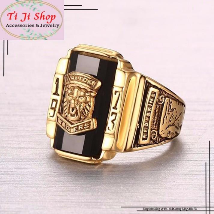 Nhẫn nam inox mạ vàng sư tử 1973 đá đen với thiết kế độc đáo mạng lại vẻ đẹp nam tính hiện đại. Màu sắc :vàng Chất liệu : inox cao cấp Bảo hành :BH khóa vĩnh viễn không đen và gỉ sắt Hình ảnh :chụp thực tế 100% tại shop – bên ngoài còn đẹp hơn trên hình Xuất xứ : Việt Nam . Size nhẫn (kích thước theo mm) - Size 7: 56 - 58mm - Size 8: 59 - 61mm - Size 9: 62 - 64mm - Size 10: 65 - 67mm - Size 11: 68 - 69mm - Size 12: 70-72mm .