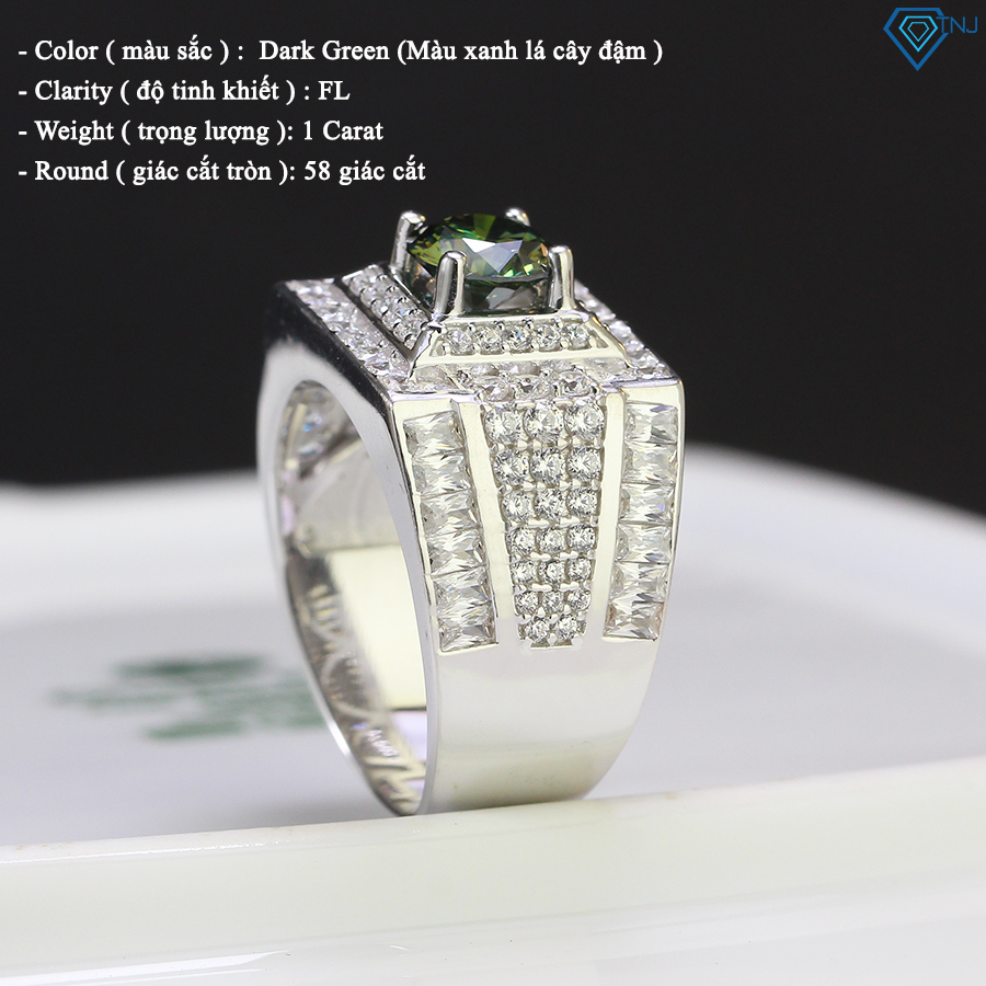 Mô tả sản phẩm nhẫn bạc nam xi bạch kim đính kim cương Moissanite xanh cao cấp NNAM0013 - Trang Sức TNJ - Thương hiệu : TNJ JEWELRY - Chất liệu bạc cao cấp 925 xi mạ bạch kim, nhẫn được đính kim cương Moissanite viên đá chủ 6.5mm - Color ( màu sắc ) : Dark Green (Màu xanh lá cây đậm ) - Clarity ( độ tinh khiết ) : FL - Weight ( trọng lượng ): 1 Carat - Round (Giác cắt tròn ): 58 giác cắt - Bộ sản phẩm: 1 nhẫn nam bạc + hộp đựng + giấy kiểm định GRA đi kèm