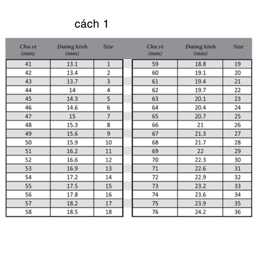 💎 Hướng dẫn chọn size nhẫn vàng: - Cách 1: Nếu bạn đang đeo sẵn một chiếc nhẫn vừa tay, bạn đặt 1 nửa nhẫn lên thước rồi đo lại đường kính của chiếc nhẫn đó (tính từ đường viền lòng trong của nhẫn) - Cách 2: Nếu bạn đang không đeo nhẫn, bạn lấy sợi dây không co dãn quấn sát chặt 1 vòng ngón tay phần đeo nhẫn, đánh dấu đúng 1 vòng và đo lại đoạn dây đó . Nên đo sít sát, không nên nới lỏng. Lưu ý: Bạn vui lòng inbox cho Shop để được tư vấn về size nhẫn một cách chính xác nhất.
