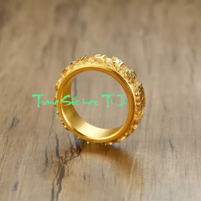 Nhẫn titan câu chú OM MANI PADME HUM xoay 360 độ Chất liệu: titan Không đen, không gỉ sét, không gây dị ứng Màu sắc : Màu vàng, phù hợp cho cả nam và nữ. Điểm nổi bật : Ký tự trên nhẫn được khắc nổi trông rất nổi bật và đẹp mắt. Chế độ bảo hành: bảo hành không đen vĩnh viễn.