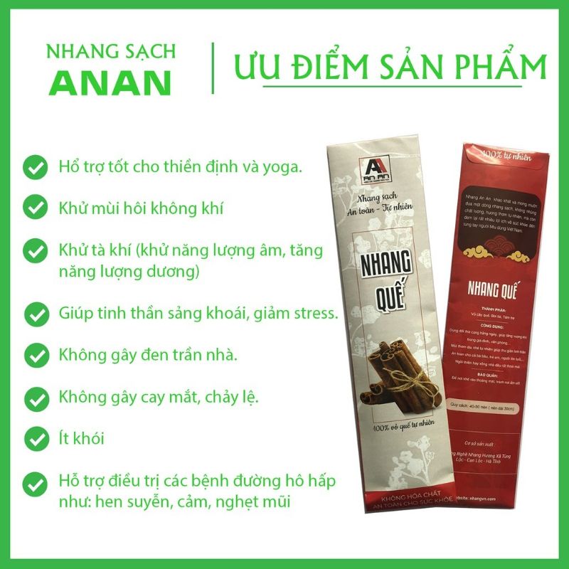 NHANG SẠCH HƯƠNG QUẾ + KHUYNH DIỆP( Hộp ~200que ) Đi ngược với truyền thống bấy lâu nay, #Nhang_sạch ANAN là một hiện thân cho sản phẩm không chỉ mang tính chất tâm linh gợi nhớ cội nguồn, mà còn có nhiều công dụng khác nhằm bảo vệ sức khỏe người sử dụng.