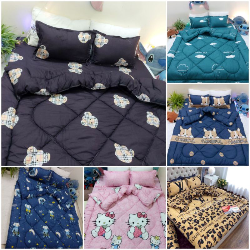 - 1 chăn phao m8x2m có bông dày sẵn bên trong phồng như ảnh nhé - 2 vỏ gối nằm -1 ga bo chun m6x2m, m8x2m hoặc tùy size nệm nhà các bạn -1 vỏ gối ôm cùng bộ
