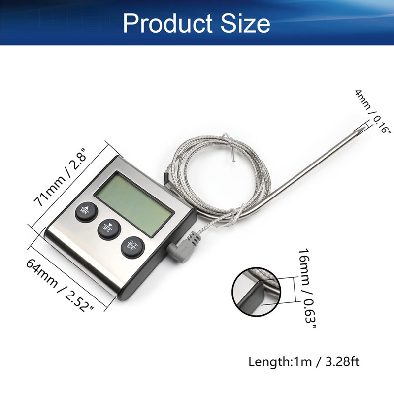 Mô tả sản phẩm 【Dễ Dàng vệ sinh và bảo quản】 Bạn có thể đo nhiệt độ của thực phẩm, và có thể dễ dàng làm sạch ngay cả khi bị bẩn. 【Đầu Dò dài đọc nhanh】 Nhiệt kế nấu ăn chỉ mất 5 giây để đo nhiệt độ và hiển thị nó trên màn hình LCD, vì vậy bạn không phải lo lắng về việc đốt tay. [Phạm Vi đo lớn] Nó có thể xử lý nhiều loại nhiệt độ, và thích hợp để kiểm soát nhiệt độ tốt của nước nóng, hạt cải, thịt, thịt nướng, món tráng miệng, món tráng miệng, đồ uống, v.v. [Hoải Động] Thưởng thức nấu ăn với những người thân yêu của bạn! Được đề xuất để kiểm soát nhiệt độ bên trong các mặt hàng nấu ăn quá nóng như dầu / sữa / thức ăn khô / trà / thịt và thực phẩm đông lạnh. 【Âm Thanh khi đạt đến nhiệt độ】 Cài đặt tối đa là 99 phút và 59 giây. Khi đếm ngược đạt 00 phút 00 giây, báo động sẽ phát ra âm thanh. Chuông báo động tắt trong 60 giây. 1. Kích thước sản phẩm: 65 * 71 * 17,5mm 2. Phạm vi đo nhiệt độ: -50°C ~ 300°C 3. Chu kỳ đo nhiệt độ: 5 giây 4. Phạm vi cài đặt nhiệt độ: 0℃~300℃ 5. Nó có chức năng chuyển đổi giữa độ C và độ F. 6. Báo động sẽ phát ra trong 60 giây. 7. Đầu dò: 110mm Phương thức hoạt động: Cách sử dụng nhiệt kế thịt này 1. Nhấn nút COOK ở mặt sau của nhiệt kế để vào chế độ nấu ăn, sử dụng nút bật / tắt để bật / tắt máy. 2. Kết nối một bên của nhiệt kế với dây nguồn. Dây nguồn có thể chịu được nhiệt độ lên đến 300°C (482°F) 3. Nhiệt kế cho biết độ C và độ F. Bạn có thể chọn C / F theo sở thích của bạn. 4. Nhấn ▲ Để chọn nhiệt độ cao, nhấn ▼ Để chọn nhiệt độ thấp. 5. Bạn có thể đặt đầu dò vào thực phẩm bạn muốn nấu, và nhiệt độ của thực phẩm sẽ được hiển thị ở bên trái của màn hình kế hoạch nhiệt độ. Cách sử dụng bộ hẹn giờ
