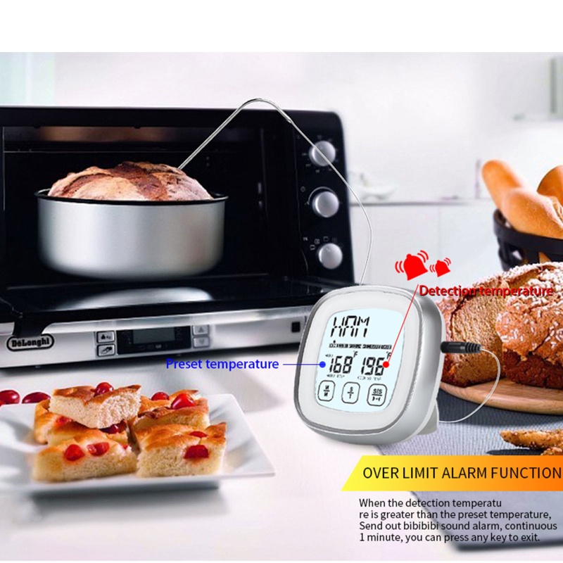 Thông số kỹ thuật: Chất liệu: ABS + thép không gỉ Màu sắc: Siver / White Phạm vi đo nhiệt độ: -20°C đến 300°C Độ phân giải nhiệt độ: 1°C Lỗi nhiệt độ: 0°C-250°C ± 1°C, 251°C-300°C ± 3 Hẹn giờ: 99 phút 59 giây Đèn nền LED xanh lam 8 lựa chọn và 5 độ nấu để lựa chọn. Chế độ báo động: hai chế độ báo thức (nhãn giờ và nhiệt kế thịt nướng) Chế độ cung cấp điện: 2xAAA pin (không bao gồm) Mặt sau dành cho vỏ của sản phẩm có giá đỡ và nam châm, dễ dàng hấp thụ các thiết bị sắt và đứng trơn tru Cho màn hình cảm ứng