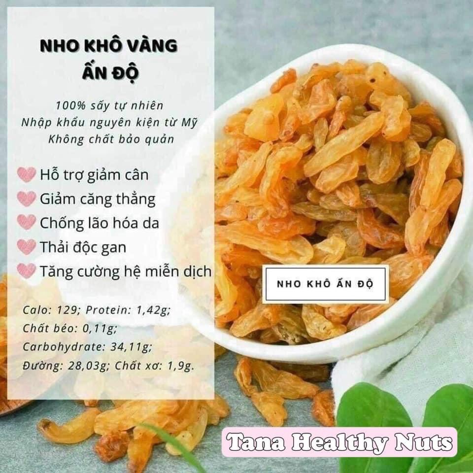 Tên sản phẩm: nho khô vàng Xuất xứ: Ấn Độ Hạn sd: 12 tháng date luôn mới Đóng gói: 500g Nho khô vàng phục vụ tết khách yên tâm hàng ngon mới thơm ngọt chua 1 tí và rất là dễ ăn Nho khô rất tốt cho sức khỏe. Nho khô được sử dụng rộng rãi trong chế biến thực phẩm và là một món ăn vặt bổ dưỡng hàng ngày. Nho rất giàu chất xơ nên có tác dụng chống thấm nước, táo bón nhuận tràng và làm giảm hiệu quả. Một trong những ứng dụng tuyệt vời khác của nho khô là để giúp xương của bạnchắc khỏe hơn vì nho giàu chất sắt và canxi . Đó cũng là lý do tại sao bạn nên ăn thường xuyên nho khô.
