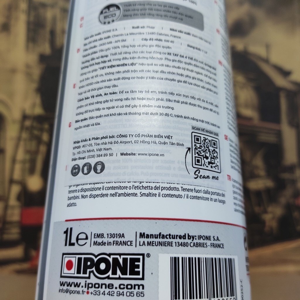 Ứng dụng: Sản phẩm được khuyến nghị sử dụng cho các loại động cơ XE TAY GA 4 THÌ đời mới, ly hợp khô không tích hợp hộp số, trong điều kiện đường hỗn hợp với yêu cầu cấp độ nhớt phù hợp. Đặt biệt thích hợp sử dụng cho các dòng Xe ga trên từ 150cc đổ lên. Dầu nhớt và sản phẩm IPONE 100% nhập khẩu nguyên chai Chính Ngạch từ Pháp (France). IPONE là thương hiệu thành lập từ năm 1985 và là nhà sản xuất dầu nhờn hàng đầu tại Pháp. Là nhà tài trợ cho giải đua xe RED BULL MOTOGP ROOKIES CUP và MXGP CHAMPIONSHIP. Thương hiêu IPONE là thương hiệu duy nhất cung cấp đầy đủ các dòng sản phẩm dành riêng cho từng dòng xe như : MOTO phân khối lớn, xe ga, xe số tự động và các dòng xe moto chuyên dụng, xe địa hình. Sản phẩm Chính Hãng được phân phối tại VNRIDE MOTO. Đôi điểu chia sẻ về IPONE từ VNRIDE: IPONE là thương hiệu thành lập từ năm 1985 và là nhà sản xuất dầu nhờn hàng đầu tại Pháp. Là nhà tài trợ cho giải đua xe RED BULL MOTOGP ROOKIES CUP và MXGP CHAMPIONSHIP. Thương hiêu IPONE là thương hiệu duy nhất cung cấp đầy đủ các dòng sản phẩm dành riêng cho từng dòng xe như : MOTO phân khối lớn, xe ga, xe số tự động và các dòng xe moto chuyên dụng, xe địa hình. Sản phẩm IPONE được phân loại rõ dàng cho từng dòng xe và công năng sử dụng giúp các Rider có thể lựa chọn sản phẩm hoàn hảo nhất cho chiếc xe của mình. Áp dụng các công nghệ dầu nhớt độc quyền như ESTER SPEED & EASY SHIFT / ESTER HIGHT PROTECTION. Các dòng sản phẩm chủ đạo của thương hiệu đến từ Pháp gồm có : Dầu phuộc thủy lực trước, Dầu trợ lực tay lái, Dầu phuộc Monoshock, Dầu dưỡng xích (sên), Dầu LAP, Dầu động cơ, Dầu phanh (thắng), Dung dịch làm mát và không thể kể đến các sản phẩm phụ trợ dành riêng cho các Rider. Sản phẩm phù hợp cho các dòng xe tay ga: AB, SH350i, Vespa.. và các dòng tay ga khác. Nhập khẩu và phân phối bởi CTY cổ phần Biển Việt