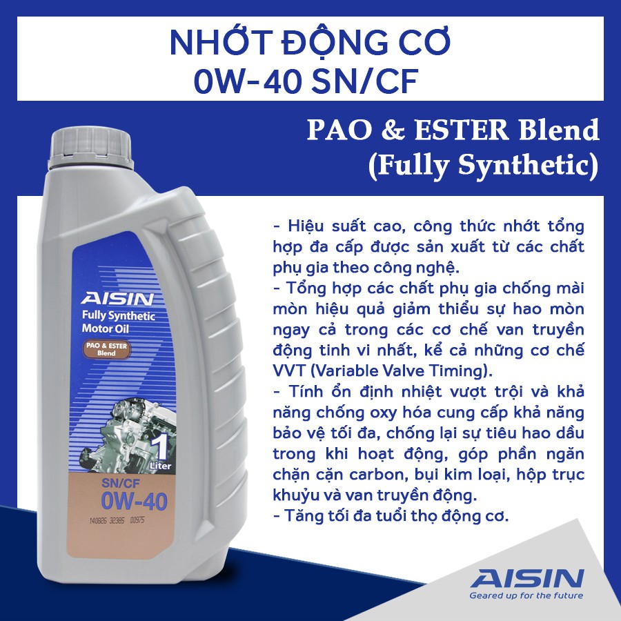 Nhớt động cơ AISIN ESEN0041P 0W-40 SN / CF PAO & ESTER Blend 1L thuộc loại nhớt tổng hợp có độ tinh khiết tốt nhất và kèm thành phần PAO & ESTER Blend hỗ trợ tối ưu cho xe, được sản xuất từ các chất phụ gia theo công nghệ sử dụng trong xe đua để phục vụ cho xe du lịch và xe tải nhẹ cho cả động cơ xăng và dầu hoạt động trong tất cả điều kiện, giúp đạt tối đa công suất và hiệu suất động cơ. Aisin là một tập đoàn của Nhật Bản chuyên phát triển và sản xuất các linh kiện và hệ thống cho ngành công nghiệp ô tô. Được xếp hạng 329 trên bảng xết hạng danh giá Fortune Global 500, Aisin được sở hữu 30% bởi tập đoàn Toyota, vinh dự mang đến những sản phẩm chất lượng và độ tin cậy cao cho thị trường thế giới. • - Nhớt động cơ AISIN ESEN0041P 0W-40 SN / CF PAO & ESTER Blend 1L là dầu nhớt tổng hợp hiệu suất cao, công thức nhớt tổng hợp đa cấp được sản xuất từ các chất phụ gia theo công nghệ sử dụng trong xe đua để phục vụ cho xe du lịch và xe tải nhẹ cho cả động cơ xăng và dầu hoạt động trong tất cả điều kiện.