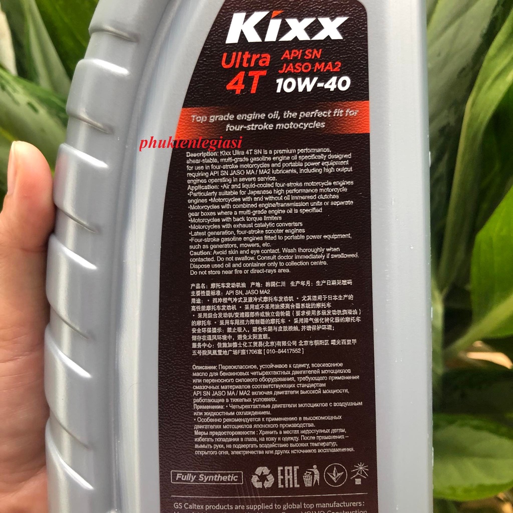 Nhớt Kixx 10W40 800ml Fully Synthentic xe số tổng hợp toàn phần nhập khẩu Hàn Quốc Nhớt Kixx 10W40 Fully Synthentic xe số tổng hợp toàn phần nhập khẩu Hàn Quốc Kixx Ultra 4T SN là nhớt tổng hợp hoàn toàn (Fully Synthetic) được nhập khẩu 100% từ nhà máy GS Hàn Quốc, đạt cấp chất lượng API SN và tiêu chuẩn JASO MA2. -Cấp nhớt SN là cấp nhớt cao nhất hiện nay của xe máy tháng 4/2020 - API SN cung cấp khả năng bảo vệ pit-tông, kiểm soát cặn lắng và chống trầy xước hiệu quả. - JASO MA2 đảm bảo độ ma sát tối ưu thích hợp cho các dòng xe côn tay đời mới có tốc độ tua máy cao như Winner, Exciter, Raider, Sonic, … Là nhà phân phối Kixx Ultra 4T SN nên khách hàng hoàn toàn yên tâm về nguồn gốc sản phẩm. Nhớt cao cấp tổng hợp toàn toàn Kixx 10W40 cho xe tay số đặc tính chạy rất êm xe, độ bền nhớt cao Số km khuyến nghị: 2500-3000km Thông số kỹ thuật: Dung tích: 1000ml HOẶC 800ML tùy phân loại. API: SN JASO: MA2 Cấp nhớt: 10W40 Xuất xứ: Nhập khẩu chính hãng Hàn Quốc