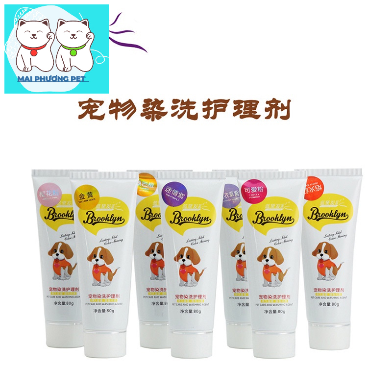 Bạn có thể tự mua và tự nhuộm lông cho thú cưng, cực kỳ dễ dàng với thuốc nhuộm lông có sẵn. Hướng dẫn sử dụng Thuốc nhuộm lông cho chó mèo Brooklyn 80g : 1. tắm sạch thú cưng 2. sấy khô lông 3. dùng găng tay và lược, chổi quét thuốc nhuộm lên lông 4. quấn lại bằng màng bọc hoặc giấy nhôm tránh lem màu ra chỗ khác 5. để 10 - 20 phút và tắm rửa sạch (không dùng sữa tắm)