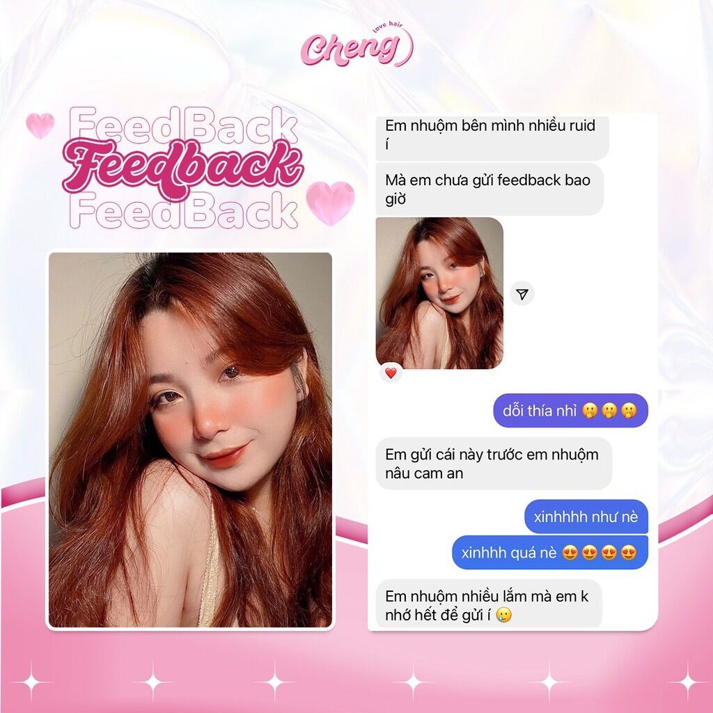 nhuộm tóc màu Nâu Cam Đất - tặng bạn nét quyến rũ tự nhiên Nếu tone nâu hơi quen thuộc quá, tone cam hơi sáng quá với bạn thì Nâu Cam Đất sẽ là lựa chọn cân bằng được tất cả nhé. Sắc thái nâu ấm và sáng nhưng vừa đủ, không bị lẫn với các màu hay gặp, lại pha thêm chút ánh cam - hồng, tạo nên mái tóc dày và tràn đầy sức sống. Tóc màu Nâu Cam Đất có khả năng hài hòa tuyệt đỉnh với mọi làn da. Da thiên về vàng, tối nhuộm lên không bị tương phản quá, đẹp một cách tự nhiên. Còn bạn nào da trắng nhuộm lại càng xinh vì có thêm một chút ánh cam, làm da trông hồng hào tươi tắn hơn. Nâu Cam Đất làm nổi bật vẻ đẹp mộc mạc, không cầu kỳ nhưng cứ khiến người ta phải ngoái nhìn mãi Khi nhuộm Nâu Cam Đất các nàng nhớ kết hợp với màu phấn và màu son cùng tone nhé (cam đỏ, cam đất, cam nude), diện mạo chúng mình sẽ lung linh x2 đó! Tặng ngay 1 lọ trợ dưỡng khi mua hàng Phù hợp với mọi tone da Lên từ nền tóc đen tự nhiên Độ bền màu: 4-6 tháng