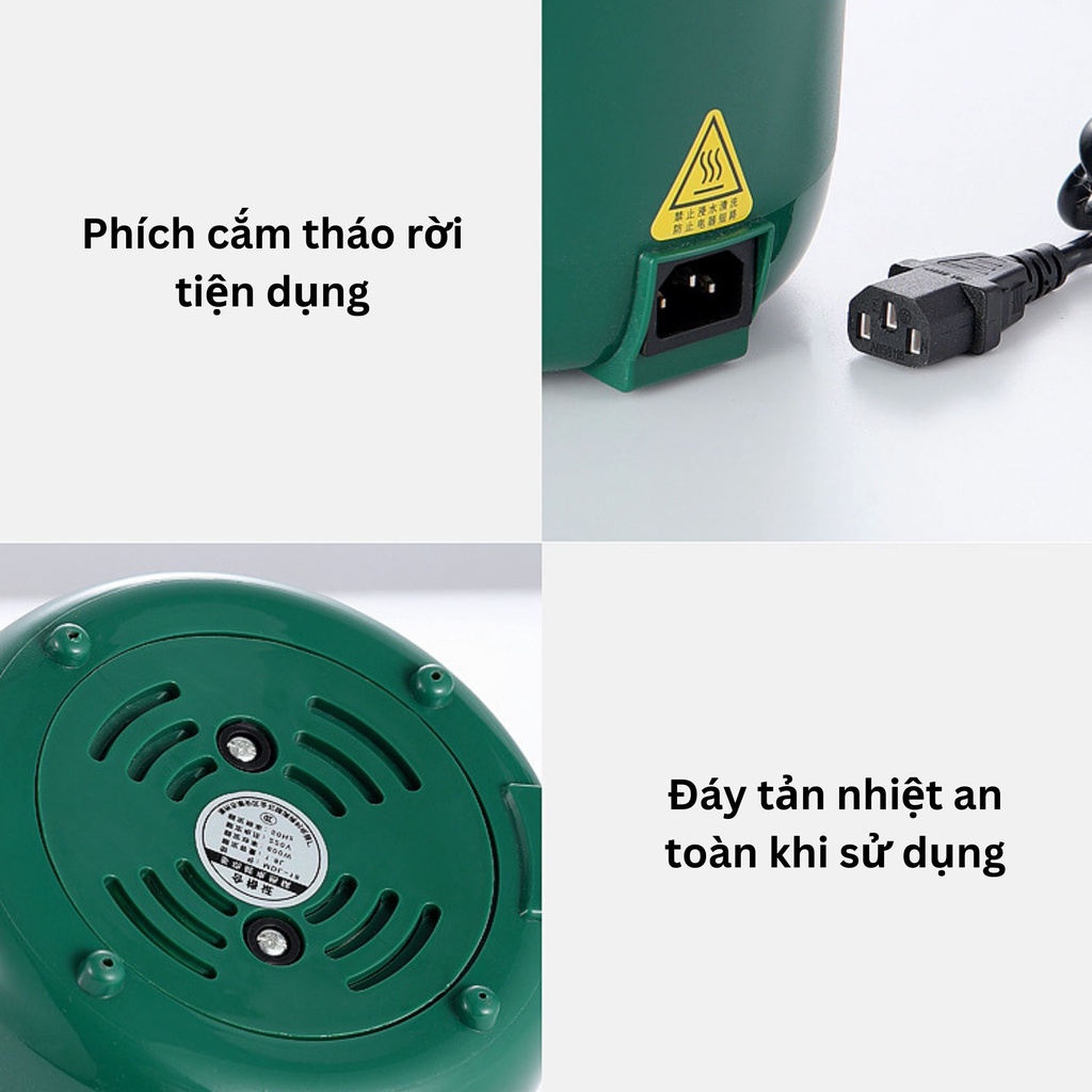 - Công suất: 50Hz/600W. Kích thước: Đường kính lòng nồi 18cm x chiều cao 10cm, có thể chứa dung tích 1.8L - Xửng hấp cùng màu kích thước cao 5.5cm, đường kính 18cm, lỗ thoáng. Nắp vung chất liệu kính an toàn, dễ quan sát đồ ăn. - 2 màu sang trọng: Xanh Rêu + Xanh Dương Đậm - Sản phẩm có lớp chống dính, hoàn toàn có thể làm các món chiên rán, xào, chịu được nhiệt độ cao, cho độ bền 3-5 năm - Chất liệu inox giúp bề mặt luôn sáng đẹp, chống bám cặn, dễ dàng vệ sinh. - Đường kính nồi: 18cm - Kiểu dáng gọn nhẹ, dễ dàng đặt trên bàn ăn, không chiếm diện tích, có xửng hấp tiện dụng hấp các loại trứng, bánh bao, rau củ,.. - Chất liệu lớp ngoài bằng nhựa đẹp, lòng nồi bằng vân đá chống dính Ceramic cao cấp dầy dặn, sáng bóng an toàn cho sức khỏe. - Bộ sản phẩm gồm: + 1 nồi lẩu + 1 dây cắm (2 chấu) + 1 vỉ hấp cùng màu nhựa nguyên sinh