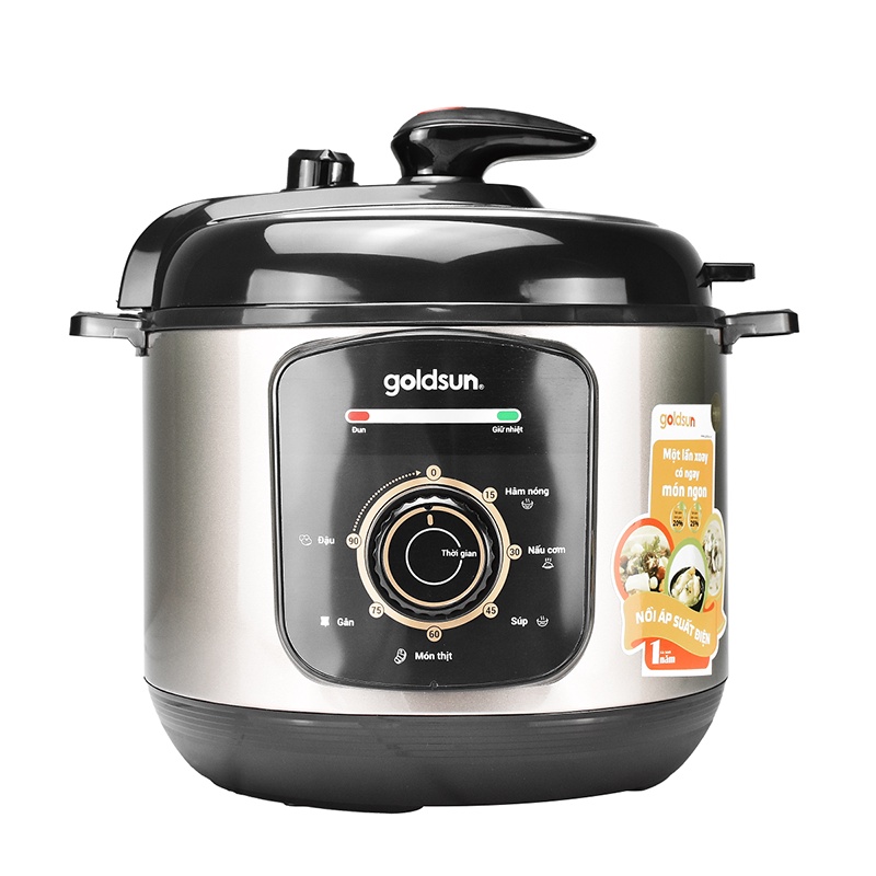 - Đa chức năng nấu Nồi áp suất điện Goldsun GPC5512 với công suất lớn 1000W cùng 6 chế độ nấu khác nhau được cài đặt sẵn, giúp bạn có thể nấu được nhiều món như cơm, cháo, súp, thịt, gân, đậu. Sau khi hoàn thành chức năng nấu được chọn, nồi sẽ tự động chuyển sang chế độ giữ ấm cho người dùng có thể thưởng thức món ăn nóng hổi thơm ngon mọi lúc.