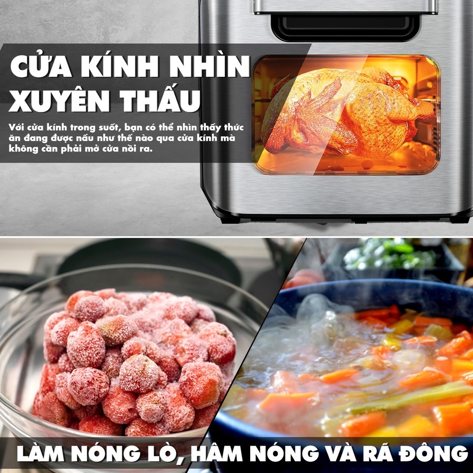 💁🏻♂️ ĐẶC ĐIỂM: - Nồi chiên không dầu thiết kế hiện đại, dung tích 12 lít tiện dụng. - Điều khiển cảm ứng với 10 menu cài đặt sẵn kèm màn hình hiển thị LED rõ nét. - Hẹn giờ 0 - 90 phút, tùy chỉnh nhiệt độ từ 80 - 200 oC. - Phù hợp dùng chiên nướng, hấp thức ăn ( bọc trong giấy bạc), rã đông thịt cá (80 oC). - Giảm tới 80% lượng mỡ thừa khi nấu, nấu nhanh với công suất 1800W, công nghệ làm nóng điện trở nhiệt - Rapid Air. - Ngăn đựng thực phẩm, khay chiên bằng thép sơn tĩnh điện chống dính bền bỉ, nấu an toàn, dễ làm sạch. - Cửa kính cường lực trong suốt dễ dàng quan sát quá trình nấu. - Bộ phụ kiện bao gồm: Vỉ nướng, khay hứng dầu mỡ, lồng nướng, xiên nướng giúp bạn tự tin thoả sức niềm đam mê nội trợ, giúp gia đình bạn có bữa ăn hấp dẫn, đa dạng món ăn.